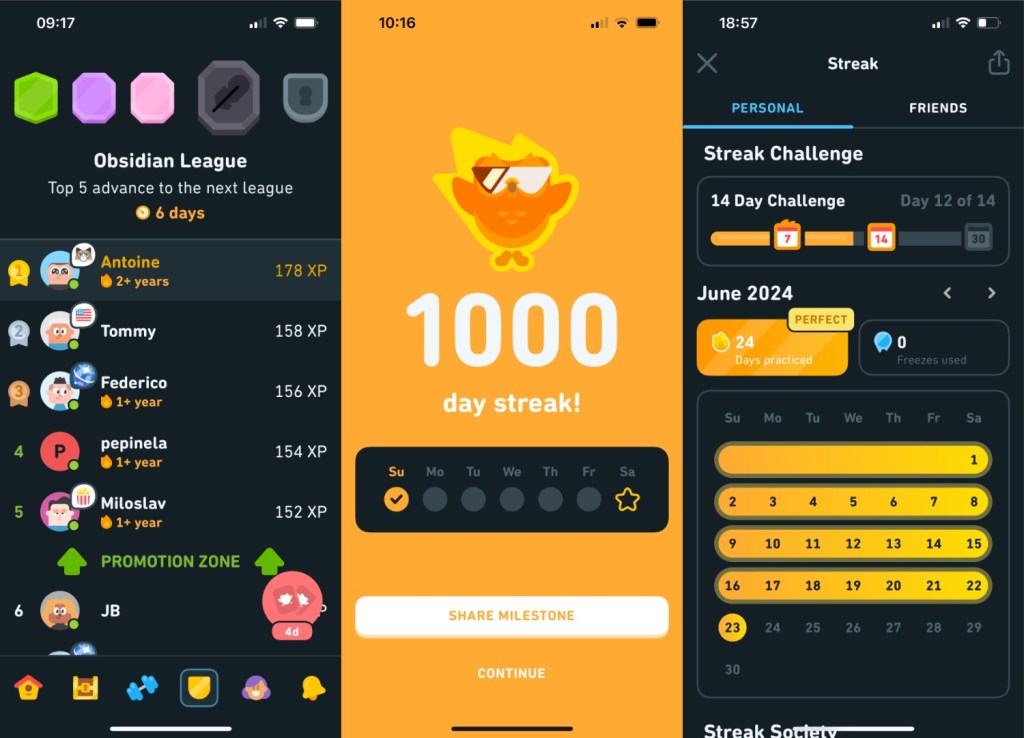 - Streaks and Leaderboards: These features tap into our competitive nature. By maintaining a streak, users are motivated to practice daily, which significantly improves retention and learning outcomes. Leaderboards add a social dimension, encouraging users to compete with friends and other learners. The streak became my “high score”, and each day I strive to beat my own record!